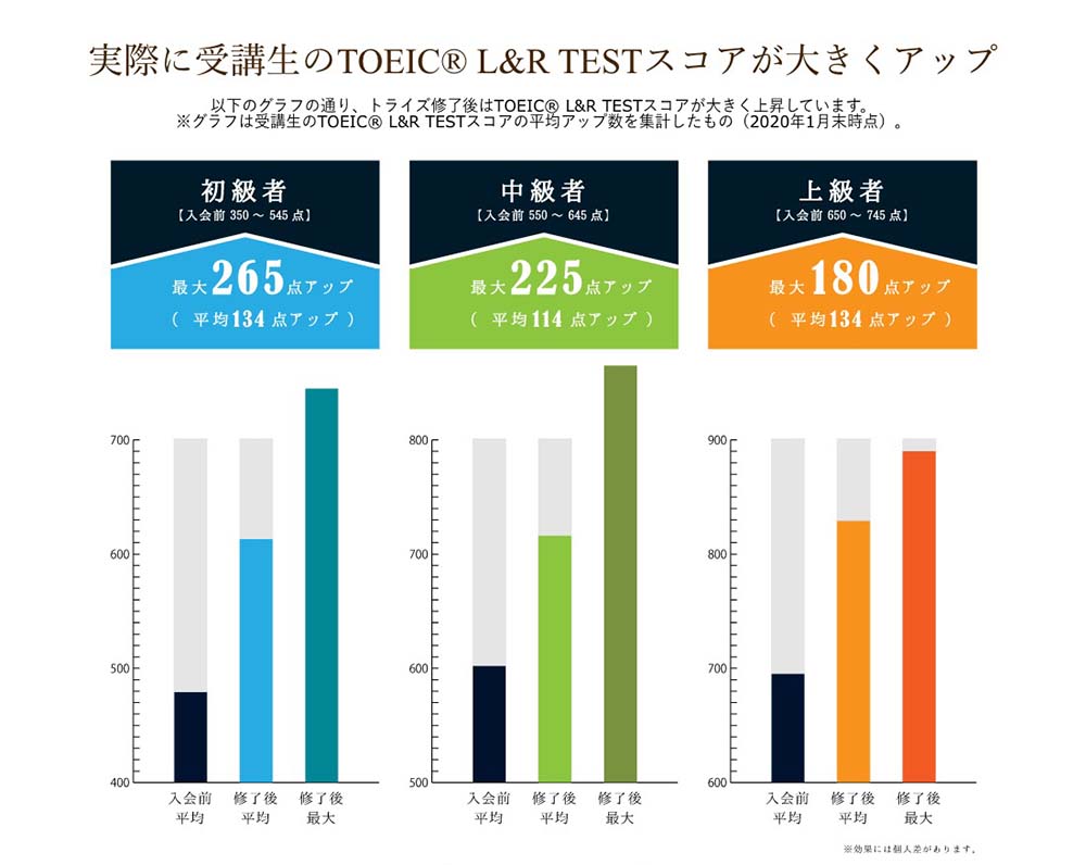 TOEIC満点保有者が監修したプログラムで短期間で最大265点アップなど信じられない成果を出す受講者が続出中です。